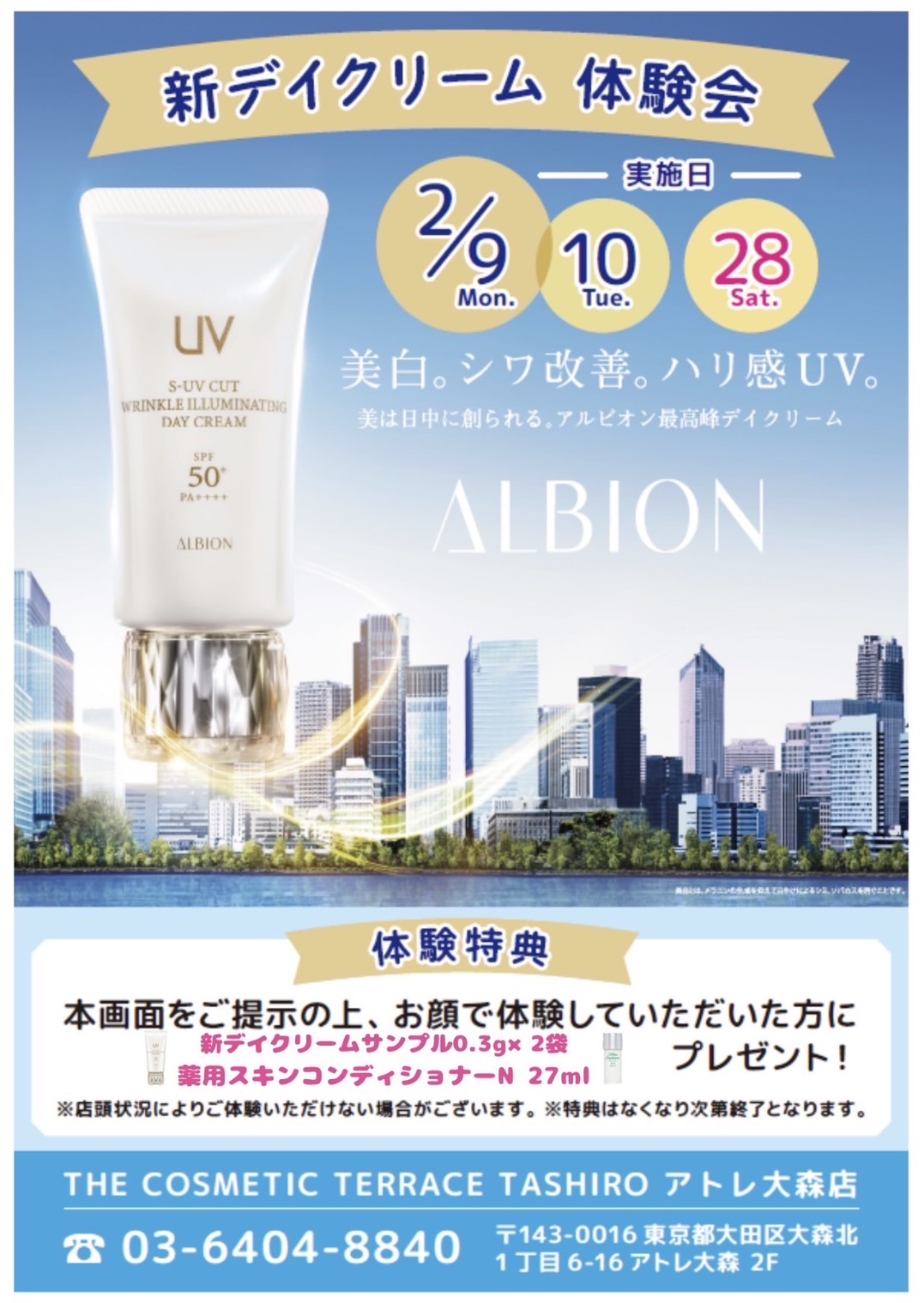 SHISEIDO(資⽣堂)、Kanebo(カネボウ)、KOSE(コーセー)、ALBION(アルビオン)など、国内⼈気ブランドのメイクアップ・スキンケア・ヘアケア・ボディケア商品を豊富にラインナップしております。じっくりカウンセリングを受けていただくことも、お好きな商品を⾃由にお試しいただくことも可能です。