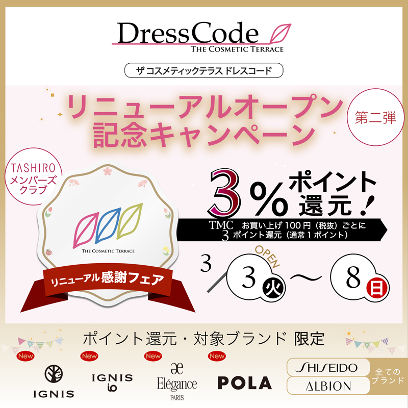 2020年11月にオンラインストアをオープン。店舗で人気の PAUL & JOE BEAUTE(ポール & ジョー ボーテ) をはじめ、d プログラム、マキアージュ(MAQuillAGE) などの資生堂ブランド、シェルクルール(Cher-Couleur)、チャコット・コスメティクス(Chacott COSMETICS) など、幅広いアイテムを取り揃えております。さらに、オンラインストア限定の取り扱いブランドも多数ございます。税込5,500円以上のお買い上げで送料無料、TMCポイントも貯まります。ぜひご利用ください。