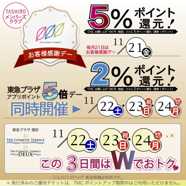 東急プラザポイント5倍×お客様感謝デー お取り置きは店頭 or お電話で承っております★|ザ・コスメティックテラス・タシロ(横浜/蒲田/新宿)