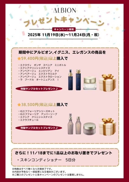 【蒲田4F店限定】ALBIONお得情報★ 11月18日(火)までに1品以上お取り置きでスキコン5日分プレゼント!