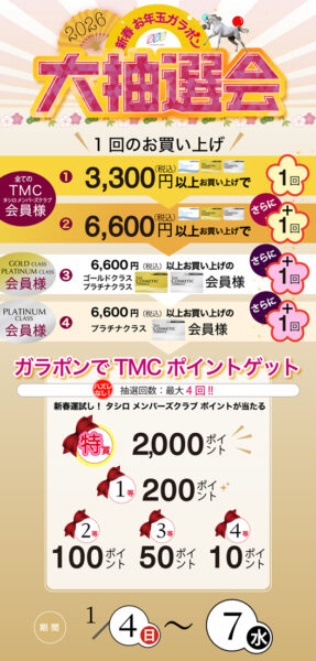 2026年 新春お年玉ガラポン大抽選会 今年もTMC会員さま限定で豪華ポイントが当たる“運試し”イベントを開催いたします! プラチナクラス会員様は最大4回まで抽選可能★