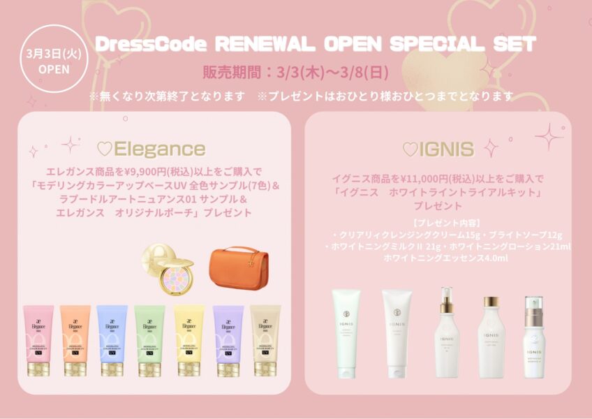 【DressCodeルミネ新宿店】 3/3(火)~3/8(日)限定!Elegance / IGNIS🎁リニューアルオープンスペシャルセット