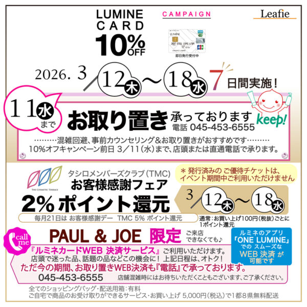 【Leafieルミネ横浜店】ルミネカード10%オフキャンペーン開催! ポール&ジョーはルミネWeb決済サービスも10%OFF☆