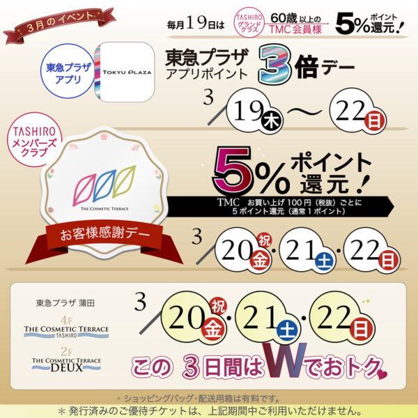 【東急プラザ蒲田4F & DEUX店】20日(金・祝)~22日(日)はWでお得! TMCポイント5%還元&東急ポイント3倍で春のお買い物がぐっとお得に🎁