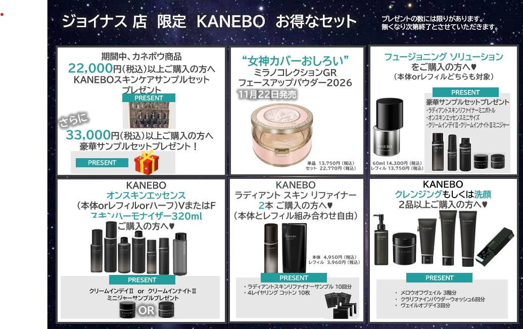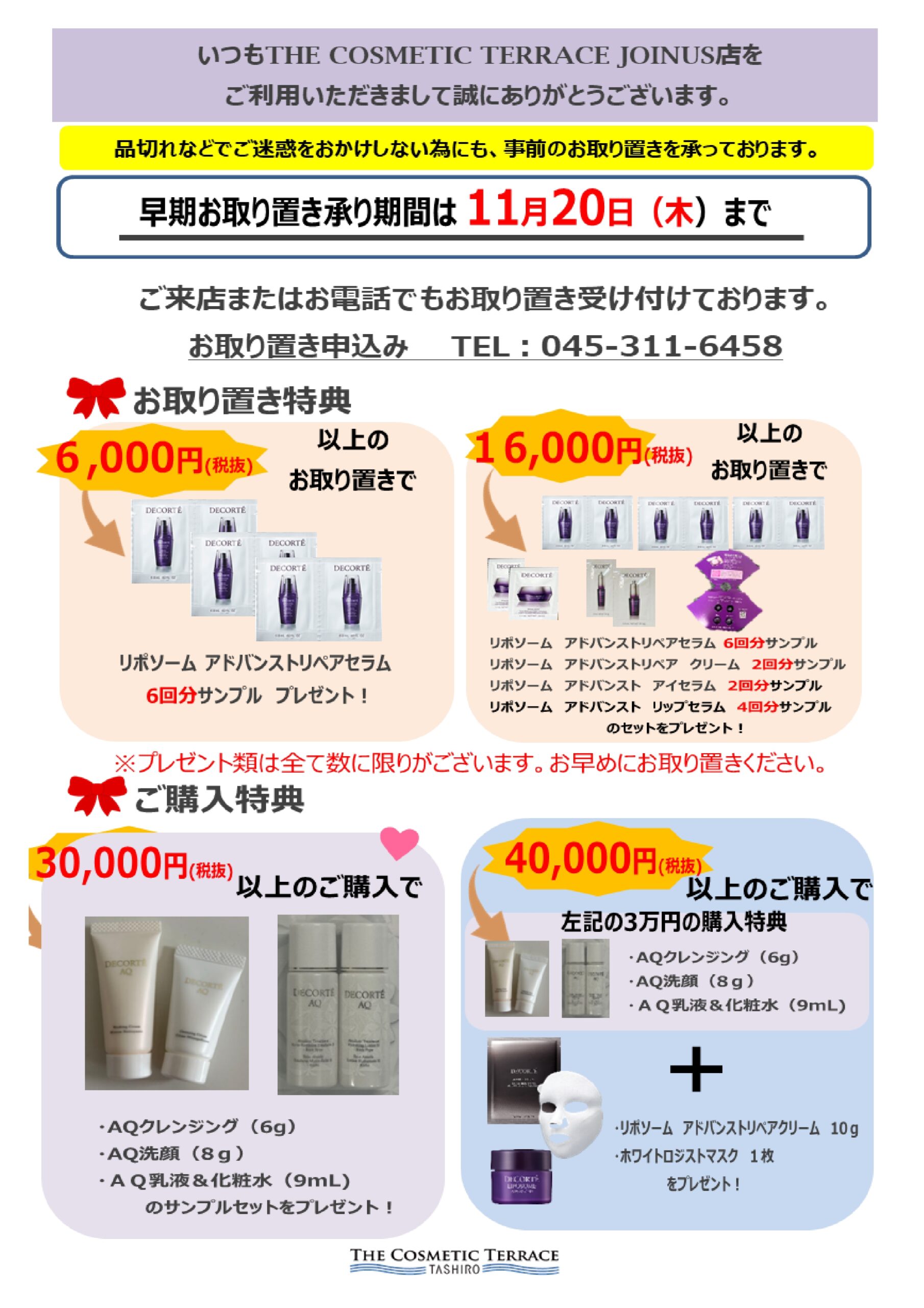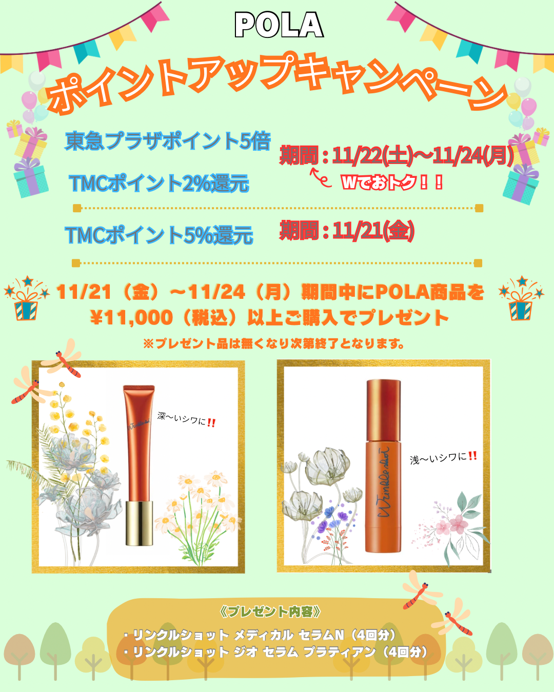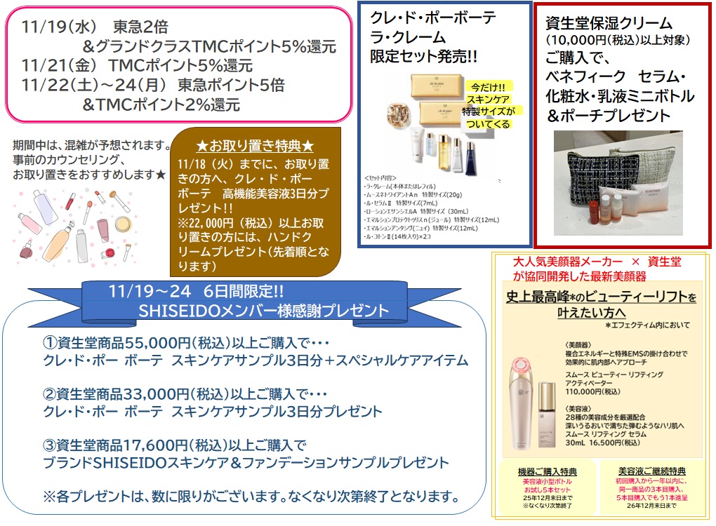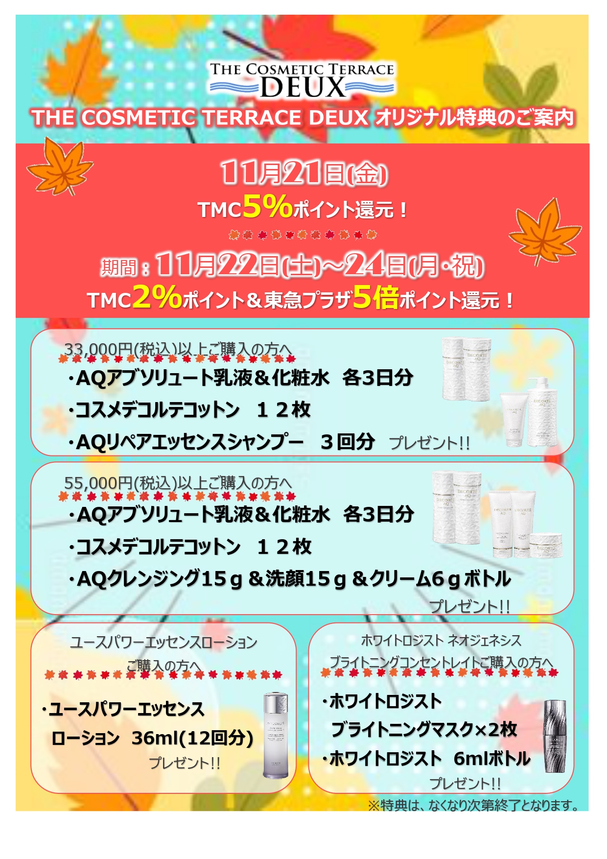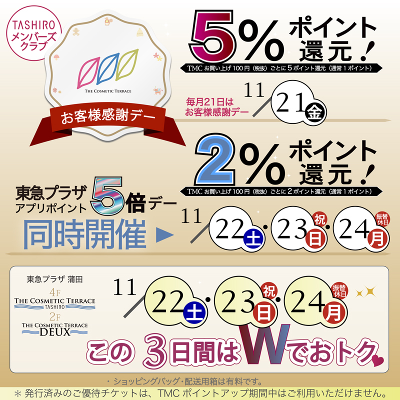2025.11.16 セール・催事 【蒲田4F店限定】KANEBOお得情報★ 税込11,000円ご購入で豪華プレゼント! 新化粧水のご予約も受け付けております☆ 東急プラザ蒲田4F店 2025.11.15 セール・催事 【蒲田4F店限定】ALBIONお得情報★ 11月18日(火)までに1品以上お取り置きでスキコン5日分プレゼント! 東急プラザ蒲田4F店 2025.11.15 セール・催事 【蒲田4F店限定】資生堂お得情報★ 税込17,600円以上ご購入豪華特典プレゼント! 限定キットも発売いたします♪ 東急プラザ蒲田4F店 2025.11.15 DEUX店 【DEUX店】POLAお得情報☆ 税込11,000円以上ご購入で豪華プレゼント! 東急プラザ蒲田2F店 2025.11.15 セール・催事 【DEUX店】KOSEお得情報☆ 税込33,000円以上ご購入で豪華プレゼント! 東急プラザ蒲田2F店 2025.11.15 セール・催事 東急プラザポイント5倍×お客様感謝デー お取り置きは店頭 or お電話で承っております★ 東急プラザ蒲田4F店 東急プラザ蒲田2F店 2025.11.13 ジョイナス店 ジョイナス店限定★シェルクルールお得情報 増量タイプがセールでお得に買えちゃう☆ ジョイナス店 2025.11.13 セール・催事 【ジョイナス店限定】ALBIONお得情報★ 先着順の超豪華特典をご用意しております! ジョイナス店 2025.11.13 セール・催事 【ジョイナス店限定】KANEBOお得情報★ 大人気スキンケア商品ご購入で豪華プレゼント♪ ジョイナス店 2025.11.13 ジョイナス店 【ジョイナス店限定】KOSEお得情報★ 税込6,600円以上お買い上げでリポソームセラム6回分プレゼント! ジョイナス店 2025.11.13 ジョイナス店 【ジョイナス店限定】資生堂お得情報★ 税込11,000円以上ご購入でうれしいサンプルつめあわせプレゼント♪ ジョイナス店 2025.11.11 セール・催事 【アトレ川崎店】秋冬の乾燥対策に!アルビオンのツヤ肌体験実施中💛 アトレ川崎店 1 / 3512345678910...NEXT35 Category: 店舗(696) ジョイナス店(239) DressCodeルミネ新宿店(217) 東急プラザ蒲田店(215) Leafieルミネ横浜店(133) DEUX店(68) アトレ大森店(40) BlueStripeアトレ川崎店(1) セール・催事(418) ブランド・商品(288) TMCアプリ(128) サービス(25) その他(13) プレスリリース(3) Archive: 月を選択 2025年11月 (24) 2025年10月 (13) 2025年9月 (22) 2025年7月 (12) 2025年6月 (11) 2025年5月 (30) 2025年4月 (11) 2025年3月 (31) 2025年2月 (8) 2025年1月 (4) 2024年12月 (42) 2024年11月 (28) 2024年10月 (3) 2024年9月 (24) 2024年8月 (13) 2024年7月 (1) 2024年6月 (1) 2024年5月 (28) 2024年4月 (4) 2024年3月 (25) 2024年2月 (12) 2024年1月 (16) 2023年12月 (34) 2023年11月 (38) 2023年10月 (13) 2023年9月 (24) 2023年8月 (19) 2023年7月 (25) 2023年6月 (17) 2023年5月 (43) 2023年4月 (30) 2023年3月 (43) 2023年2月 (17) 2023年1月 (8) 2022年12月 (22) 2022年11月 (33) 2022年10月 (9) 2022年9月 (7) 2022年8月 (4) 2022年7月 (5) 2022年6月 (2) 2022年5月 (1) 2022年4月 (1) 2022年3月 (1) 2022年2月 (1) 2021年4月 (1)