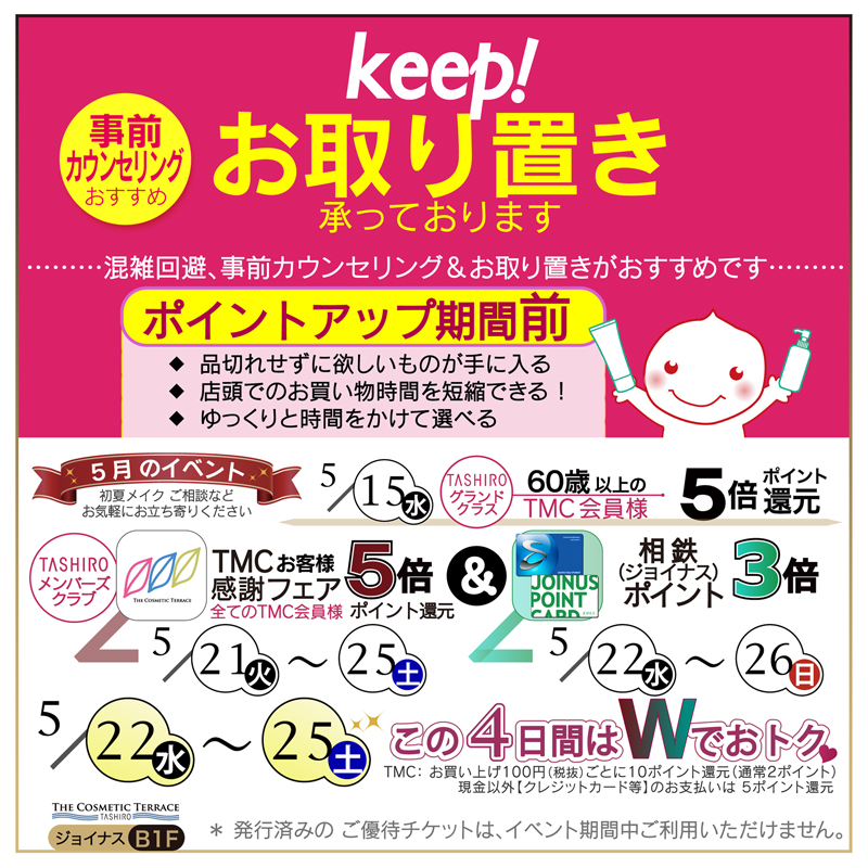 2024.11.16 TMCアプリ 【ジョイナス店限定】KOSEお得情報★ 税込6,600円以上お買い上げでサンプル3日分 ジョイナス店 2024.11.16 DEUX店 【DEUX店】KOSEお取り置き特典★ 税込11,000円以上お取り置きで豪華プレゼント 東急プラザ蒲田2F店 2024.11.16 TMCアプリ 【蒲田4F店限定】ALBIONお得情報★ 1品以上お取り置きでスキコンミニボトル!! 東急プラザ蒲田4F店 2024.11.16 TMCアプリ 【ジョイナス店限定】KANEBOお得情報★ 税込6,600円以上の取り置きでカレンダープレゼント ジョイナス店 2024.11.16 TMCアプリ 【ジョイナス店限定】資生堂お得情報★ 税込22,000以上ご購入で豪華サンプルプレゼント♪ ジョイナス店 2024.11.16 TMCアプリ 【蒲田4F店限定】KANEBOお得情報★ 11,000円(税込)以上お取り置きで豪華ギフト♪ 東急プラザ蒲田4F店 2024.11.15 TMCアプリ 【蒲田4F店限定】資生堂お得情報★ お取り置きいただいたお客様へ豪華プレゼント♪ 東急プラザ蒲田4F店 2024.11.15 TMCアプリ ジョイナス店★相鉄ジョイナス3倍×TMC5倍 22日~26日は相鉄ポイントとWでお得☆ ジョイナス店 2024.11.15 DEUX店 蒲田2F&4F店☆東急プラザ×TMC W5倍 お取り置きは店頭orお電話で承っております 東急プラザ蒲田4F店 東急プラザ蒲田2F店 2024.11.09 TMCアプリ 【シンピュルテ】DressCode店限定特典★ 税込5,000円以上ご購入で豪華サンプルプレゼント ルミネ新宿店 2024.11.09 DressCodeルミネ新宿店 【シェルクルール】DressCode店限定特典★ お取り置き特典&数量限定セット発売! ルミネ新宿店 2024.11.09 Leafieルミネ横浜店 【Leafieルミネ横浜店】PAUL&JOE特典 ルミネWEB決済サービスで自宅から注文&決済も! ルミネ横浜店 4 / 11PREV12345678910...NEXT11 Category: 店舗(715) ジョイナス店(247) DressCodeルミネ新宿店(219) 東急プラザ蒲田店(219) Leafieルミネ横浜店(135) DEUX店(73) アトレ大森店(43) BlueStripeアトレ川崎店(6) セール・催事(436) ブランド・商品(288) TMCアプリ(128) サービス(26) その他(13) プレスリリース(3) Archive: 月を選択 2025年12月 (15) 2025年11月 (28) 2025年10月 (13) 2025年9月 (22) 2025年7月 (12) 2025年6月 (11) 2025年5月 (30) 2025年4月 (11) 2025年3月 (31) 2025年2月 (8) 2025年1月 (4) 2024年12月 (42) 2024年11月 (28) 2024年10月 (3) 2024年9月 (24) 2024年8月 (13) 2024年7月 (1) 2024年6月 (1) 2024年5月 (28) 2024年4月 (4) 2024年3月 (25) 2024年2月 (12) 2024年1月 (16) 2023年12月 (34) 2023年11月 (38) 2023年10月 (13) 2023年9月 (24) 2023年8月 (19) 2023年7月 (25) 2023年6月 (17) 2023年5月 (43) 2023年4月 (30) 2023年3月 (43) 2023年2月 (17) 2023年1月 (8) 2022年12月 (22) 2022年11月 (33) 2022年10月 (9) 2022年9月 (7) 2022年8月 (4) 2022年7月 (5) 2022年6月 (2) 2022年5月 (1) 2022年4月 (1) 2022年3月 (1) 2022年2月 (1) 2021年4月 (1)
