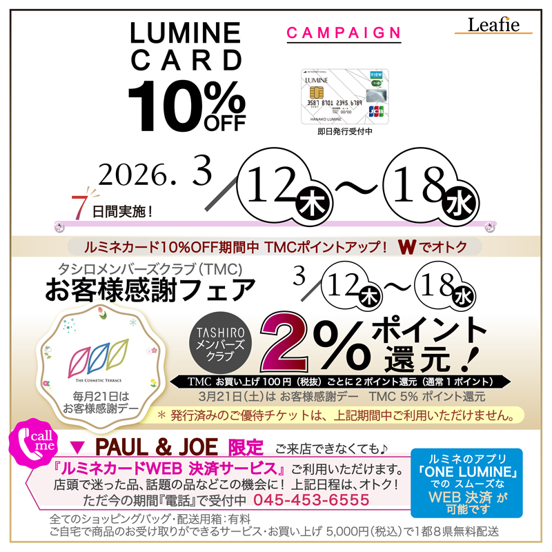 2026.03.15 Leafieルミネ横浜店セール・催事店舗 【Leafieルミネ横浜店】ルミネカード10%OFF期間中、TMCポイントが 2%還元にアップ! さらに3/21(土)は TMCポイント5%還元の特別デー🎀 ルミネ横浜店 2026.03.15 DressCodeルミネ新宿店セール・催事店舗 【DressCode店】Elegance の取り扱いがスタート🥳3/18(水)までの『ルミネカード10%OFFキャンペーン』で当店限定特典もご用意! ルミネ新宿店 2026.03.13 セール・催事店舗東急プラザ蒲田店 【東急プラザ蒲田4F】カバーマーク・アクセーヌ🎡あの人気商品をご購入で豪華ミニサイズプレゼント★ 東急プラザ蒲田4F店 2026.03.13 DEUX店セール・催事店舗 【DEUX店】POLA🎁11,000円以上購入でホワイトショット3品進呈🧸 東急プラザ蒲田2F店 2026.03.13 セール・催事店舗東急プラザ蒲田店 【東急プラザ蒲田4F店】KANEBO💝数量限定キット&セット購入で豪華ミニサイズをプレゼント🌼 東急プラザ蒲田4F店 2026.03.12 DEUX店セール・催事店舗 【DEUX店】KOSE🏟️AQ・リポソーム・雪肌精など対象購入で豪華サンプル進呈🧢 東急プラザ蒲田2F店 2026.03.12 セール・催事店舗東急プラザ蒲田店 【東急プラザ蒲田4F店】ALBION🩵38,500円以上で特別サンプルセット進呈★ 18日までのお取り置きで人気クリーム2日分も🍒 東急プラザ蒲田4F店 2026.03.12 セール・催事店舗東急プラザ蒲田店 【東急プラザ蒲田4F店】20〜22日はポイントWでお得! 3/18までに資生堂商品を3,300円以上お取り置きでクレド1日分プレゼント🥳 東急プラザ蒲田4F店 2026.03.12 ジョイナス店セール・催事店舗 【ジョイナス店】KANEBO🎀新化粧水でクリーム2種、クリーム購入で30mL美容液♪ 金額に応じて豪華サンプルももらえる特別企画★ ジョイナス店 2026.03.12 ジョイナス店セール・催事店舗 【ジョイナス店】ALBION🍀7,700円(税込)以上のお取り置きで、アンフィネス クレンジングオイル(30g)プレゼント🎁 ジョイナス店 2026.03.12 DEUX店セール・催事店舗東急プラザ蒲田店 【東急プラザ蒲田4F & DEUX店】20日(金・祝)~22日(日)はWでお得! TMCポイント5%還元&東急ポイント3倍で春のお買い物がぐっとお得に🎁 東急プラザ蒲田4F店 東急プラザ蒲田2F店 2026.03.11 ジョイナス店セール・催事店舗 【ジョイナス店】KOSE💜リポソームからAQまで豪華サンプルがもらえる、今回だけの特別お取り置き特典⚾ ジョイナス店 1 / 7212345678910...NEXT72 Category: 店舗(792) ジョイナス店(266) DressCodeルミネ新宿店(245) 東急プラザ蒲田店(235) Leafieルミネ横浜店(146) DEUX店(87) アトレ大森店(56) BlueStripeアトレ川崎店(18) セール・催事(508) ブランド・商品(290) TMCアプリ(128) サービス(28) その他(15) プレスリリース(3) Archive: 月を選択 2026年3月 (27) 2026年2月 (7) 2026年1月 (7) 2025年12月 (53) 2025年11月 (28) 2025年10月 (13) 2025年9月 (22) 2025年7月 (12) 2025年6月 (11) 2025年5月 (30) 2025年4月 (11) 2025年3月 (31) 2025年2月 (8) 2025年1月 (4) 2024年12月 (42) 2024年11月 (28) 2024年10月 (3) 2024年9月 (24) 2024年8月 (13) 2024年7月 (1) 2024年6月 (1) 2024年5月 (28) 2024年4月 (4) 2024年3月 (25) 2024年2月 (12) 2024年1月 (16) 2023年12月 (34) 2023年11月 (38) 2023年10月 (13) 2023年9月 (24) 2023年8月 (19) 2023年7月 (25) 2023年6月 (17) 2023年5月 (43) 2023年4月 (30) 2023年3月 (43) 2023年2月 (17) 2023年1月 (8) 2022年12月 (22) 2022年11月 (33) 2022年10月 (9) 2022年9月 (7) 2022年8月 (4) 2022年7月 (5) 2022年6月 (2) 2022年5月 (1) 2022年4月 (1) 2022年3月 (1) 2022年2月 (1) 2021年4月 (1)