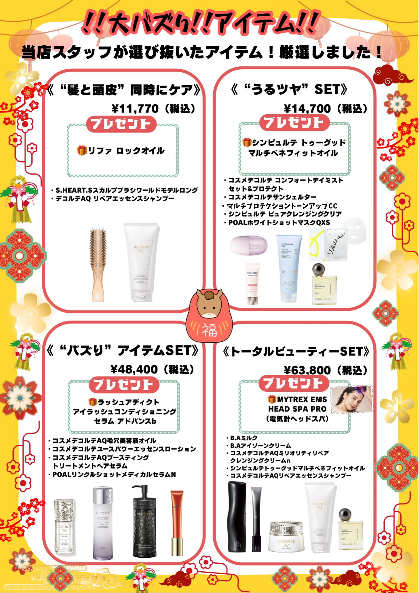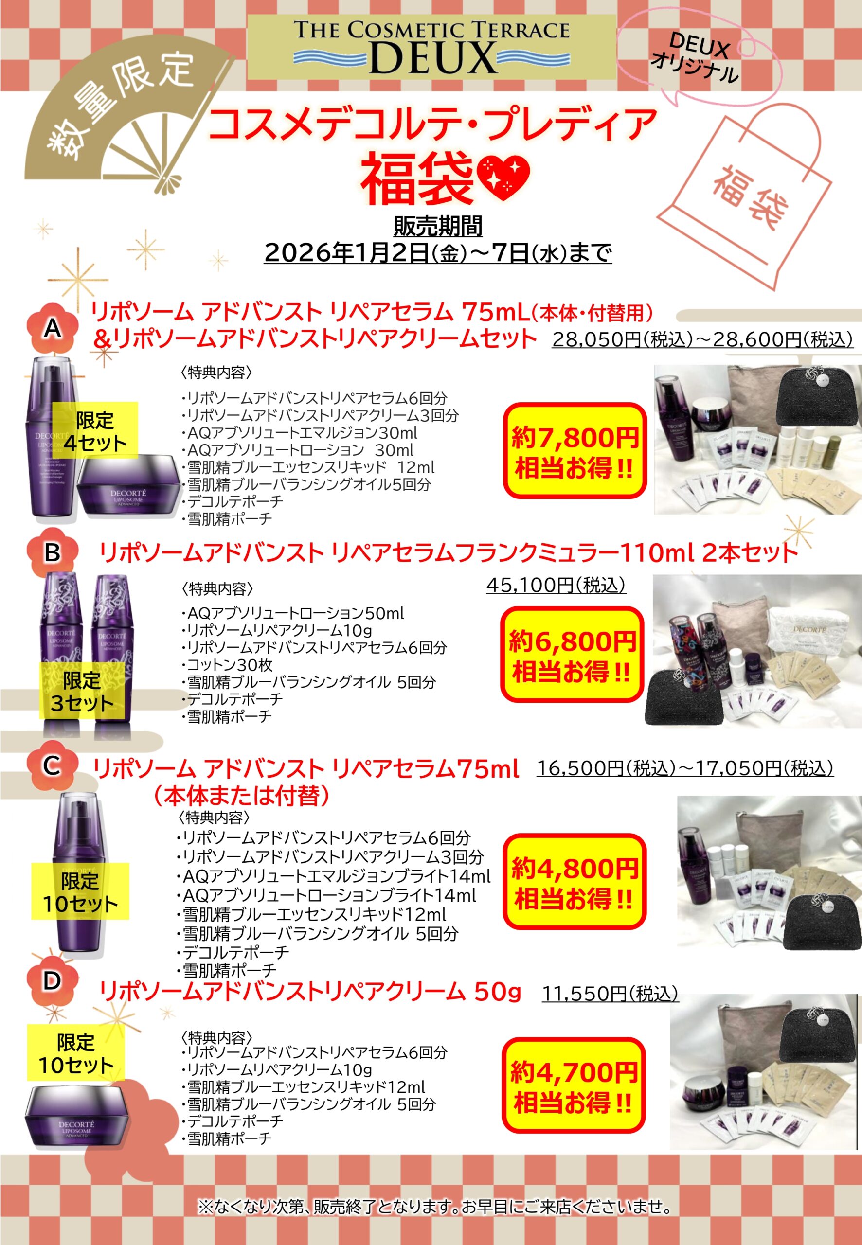 2025.12.13 DEUX店セール・催事店舗 【DEUX店】2026年福袋★ジュリーク スタッフが自信を持って選んだ癒やしの限定キット★ ご予約は本日よりスタート♪ 東急プラザ蒲田2F店 2025.12.13 DEUX店セール・催事店舗 【DEUX店】2026年完全オリジナル福袋 「あのスタッフさんのオススメ」が福袋に! 裏ワザ愛用アイテム満載のオリジナルセット★ 東急プラザ蒲田2F店 2025.12.13 DEUX店セール・催事店舗 【DEUX店】2026年福袋★POLA 年に一度の美肌投資!POLAの福袋、本日より予約開始! 東急プラザ蒲田2F店 2025.12.13 DEUX店セール・催事店舗 【DEUX店】2026年福袋★KOSE 今年は9種類ご用意いたしました★ 限定3個の福袋もあるのでお早めにご予約ください♪ 東急プラザ蒲田2F店 2025.12.13 ジョイナス店セール・催事店舗 【ジョイナス店】2026年福袋★「シェルクルール」「カバーマーク」「アクセーヌ」 低刺激処方の定番アイテムを厳選し、さらに豪華特典付き☆ ジョイナス店 2025.12.13 ジョイナス店セール・催事店舗 【ジョイナス店】2026年完全オリジナル福袋 「私たちが本当に使っているお気に入り」を集めました♪ スタッフ厳選の推しコスメ福袋、今年だけの特別セット☆ ジョイナス店 2025.12.13 ジョイナス店セール・催事店舗 【ジョイナス店】2026年福袋★ALBION 数量限定!あなただけのスペシャルオーダーメイド福袋も登場☆ ジョイナス店 2025.12.13 ジョイナス店セール・催事店舗 【ジョイナス店】2026年福袋★KANEBO 例年よりさらにお得な内容、確実に手に入れるなら今すぐご予約を☆ ジョイナス店 2025.12.13 Leafieルミネ横浜店セール・催事店舗 【Leafieルミネ横浜店】2026年福袋① ALBION人気アイテムが豪華特典付きで登場! 数量限定のため、売り切れ前にぜひご予約ください☆ ルミネ横浜店 2025.12.12 BlueStripeアトレ川崎店セール・催事店舗 BlueStripeアトレ川崎店★12日~お客様感謝デー×ハッピーWポイント開催中!! アトレ川崎店 2025.12.12 BlueStripeアトレ川崎店セール・催事店舗 【アトレ川崎店】KOSEお得情報☆ 12月12日(金)~14日(日)ハッピーWポイント&TMCアプリ2%還元期間中限定!! アトレ川崎店 2025.12.06 BlueStripeアトレ川崎店DEUX店DressCodeルミネ新宿店Leafieルミネ横浜店アトレ大森店ジョイナス店セール・催事店舗東急プラザ蒲田店 2026年 新春イベントのご案内 新年の運試しにぴったり!数量限定の福袋をご用意しています♪ ジョイナス店 東急プラザ蒲田4F店 アトレ大森店 東急プラザ蒲田2F店 アトレ川崎店 ルミネ新宿店 ルミネ横浜店 1 / 6512345678910...NEXT65 Category: 店舗(715) ジョイナス店(247) DressCodeルミネ新宿店(219) 東急プラザ蒲田店(219) Leafieルミネ横浜店(135) DEUX店(73) アトレ大森店(43) BlueStripeアトレ川崎店(6) セール・催事(436) ブランド・商品(288) TMCアプリ(128) サービス(26) その他(13) プレスリリース(3) Archive: 月を選択 2025年12月 (15) 2025年11月 (28) 2025年10月 (13) 2025年9月 (22) 2025年7月 (12) 2025年6月 (11) 2025年5月 (30) 2025年4月 (11) 2025年3月 (31) 2025年2月 (8) 2025年1月 (4) 2024年12月 (42) 2024年11月 (28) 2024年10月 (3) 2024年9月 (24) 2024年8月 (13) 2024年7月 (1) 2024年6月 (1) 2024年5月 (28) 2024年4月 (4) 2024年3月 (25) 2024年2月 (12) 2024年1月 (16) 2023年12月 (34) 2023年11月 (38) 2023年10月 (13) 2023年9月 (24) 2023年8月 (19) 2023年7月 (25) 2023年6月 (17) 2023年5月 (43) 2023年4月 (30) 2023年3月 (43) 2023年2月 (17) 2023年1月 (8) 2022年12月 (22) 2022年11月 (33) 2022年10月 (9) 2022年9月 (7) 2022年8月 (4) 2022年7月 (5) 2022年6月 (2) 2022年5月 (1) 2022年4月 (1) 2022年3月 (1) 2022年2月 (1) 2021年4月 (1)